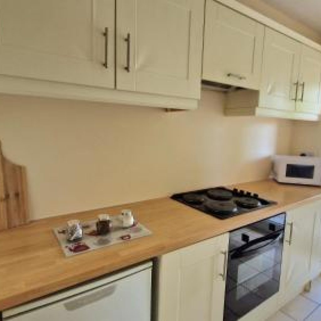 Each apartment features a fully equipped kitchen and lounge area. The kitchens include a hob/oven, fridge, and microwave, along with essential crockery, cutlery, and cooking utensils. The lounge area is furnished with comfortable seating, a dining table, and chairs.